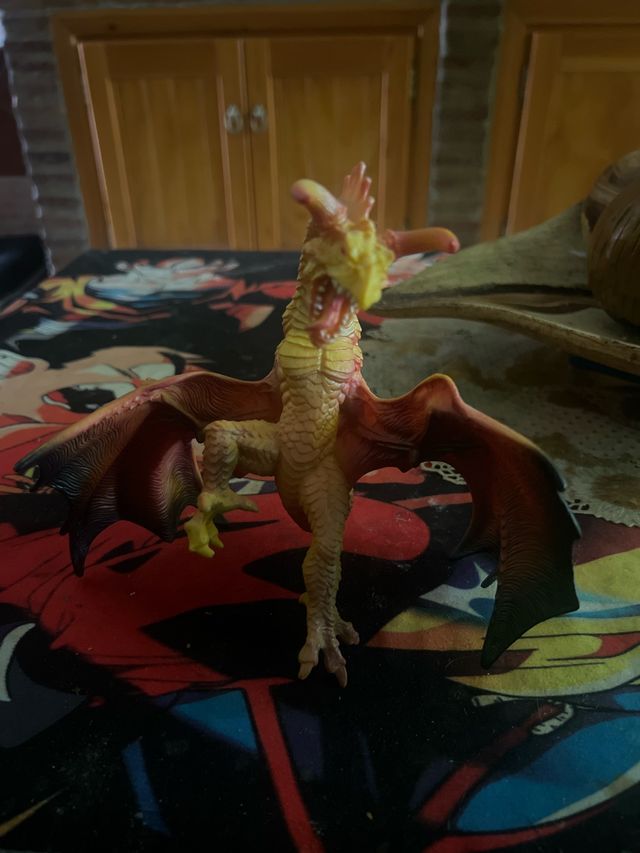 Figura de dragón de color amarillo con detalles en rojo y naranja. - Alas detalladas. - Cuerpo escamoso. - Cabeza con cresta.
