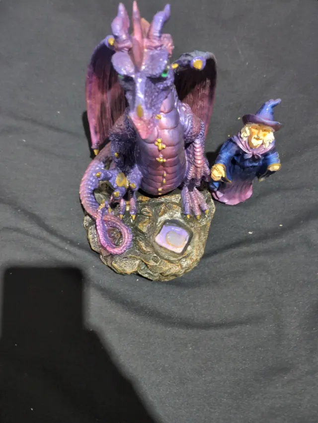 Figura decorativa de un dragón morado con un mago. - Detalles en tonos morados y dorados. - Base rocosa con gema. - Diseño fantasioso.