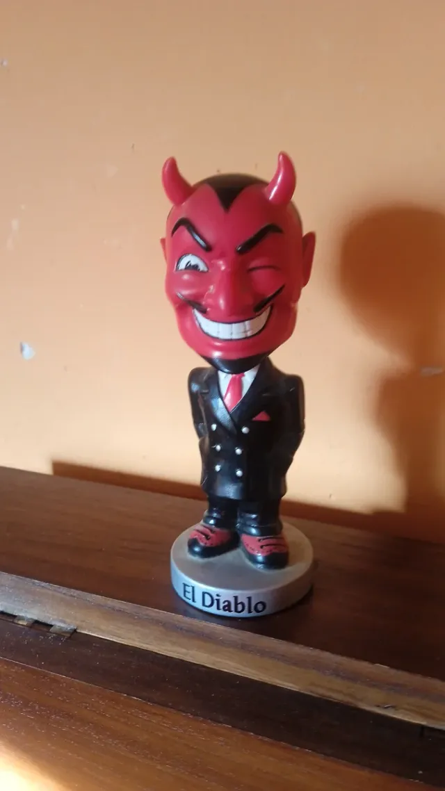 Figura decorativa del personaje El Diablo. - Diseño con traje negro y corbata roja. - Cabeza con cuernos y expresión pícara. - Base redonda con el nombre El Diablo.