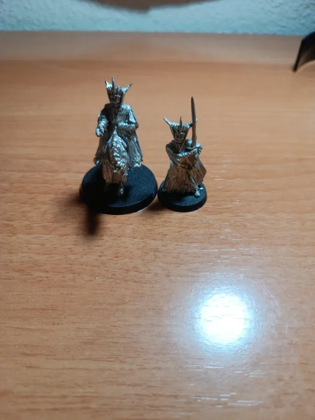 Figuras de metal de El Señor de los Anillos, representando a Boca de Sauron. - Una figura montada a caballo. - Otra figura de pie con espada.