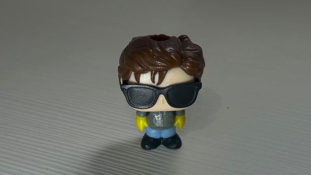 Figura coleccionable de Stranger Things. - Diseño con gafas de sol y pelo castaño. - Incluye guantes amarillos y ropa gris y azul.