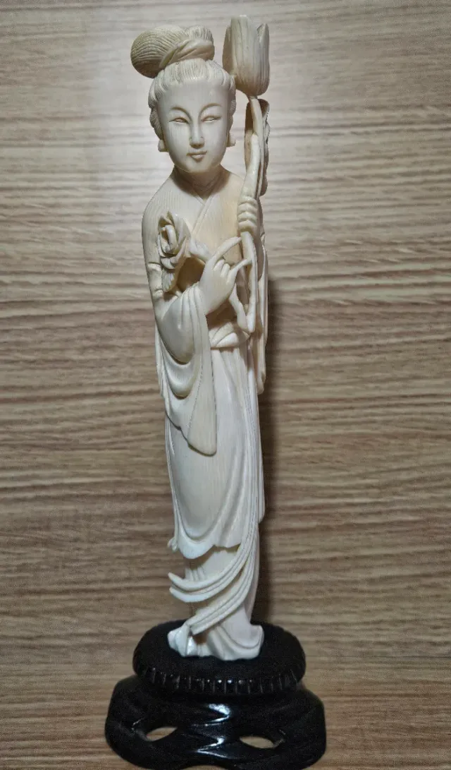 Figura decorativa de una geisha sosteniendo una flor de loto. - Detallada escultura. - Base ornamental.