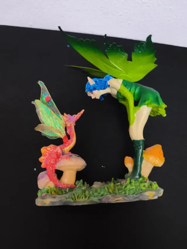 Detalles del producto🐉 Figura decorativa de fantasía con un hada y un dragón. Representa una escena mitológica sobre una base con setas y hierba.