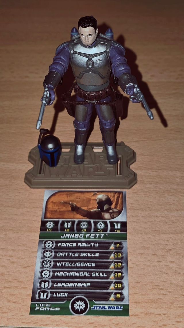 Detalles del productoFigura de Star Wars - Jango Fett versión Hasbro del 2008. Incluye su base con el logo de Star Wars y una carta de juego.
