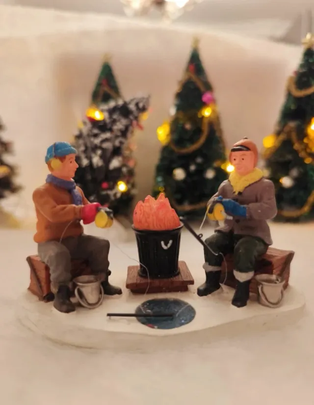 Detalles del productoAdorno de escena invernal con dos figuras pescando en el hielo. Ideal para decoraciones navideñas.