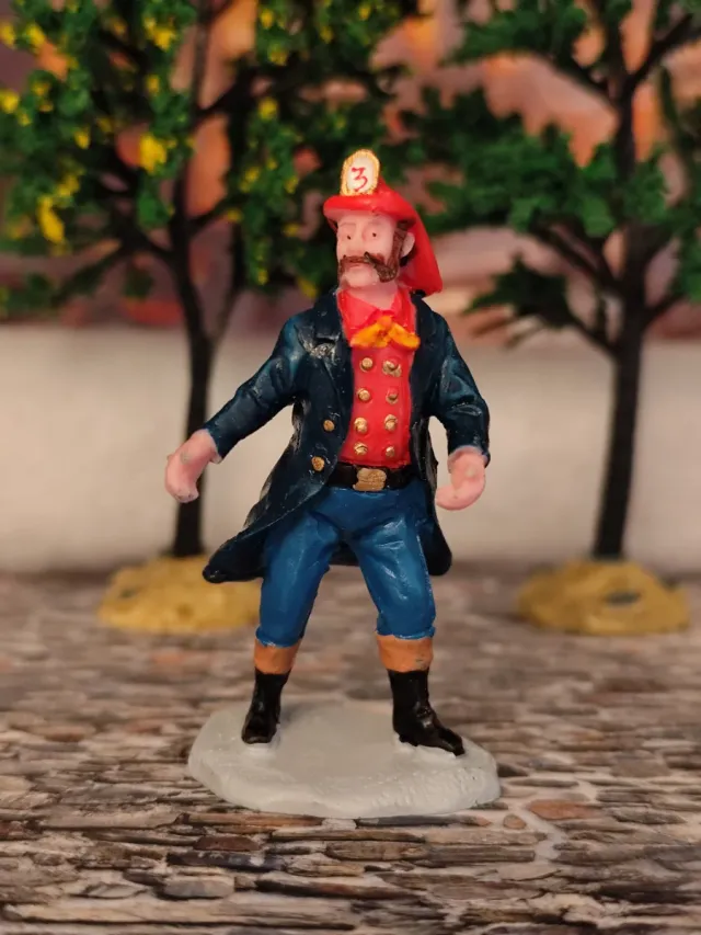 Figura decorativa de bombero con uniforme detallado. - Casco rojo con número 3. - Chaqueta azul oscuro. - Chaleco rojo con botones dorados. - Pantalones azules. - Botas negras.