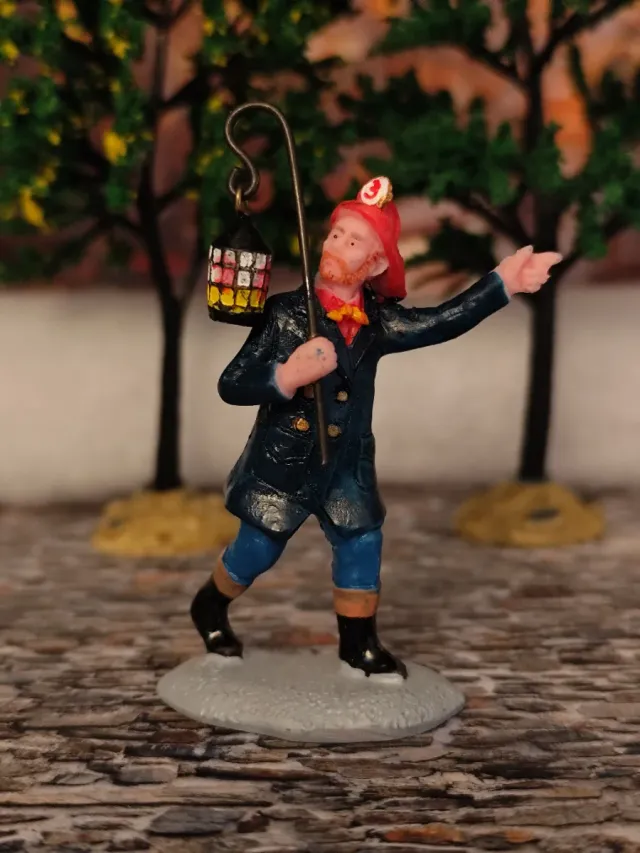 Figura decorativa de un hombre con un farolillo y un bastón. - Detalle de sombrero rojo y abrigo azul. - Pantalones azules y botas negras. - Farolillo con detalles de colores.