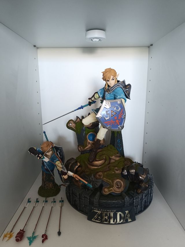 Detalles del productoEspectacular figura de resina de Link de The Legend of Zelda, de la marca Oz Studio. Impecable estado. Incluye una figura adicional de Link más pequeña y varias flechas. - Figura principal de Link con escudo y espada. - Figura pequeña de Link con arco y flecha. - 5 flechas adicionales. - Base detallada con diseño de la saga Zelda.