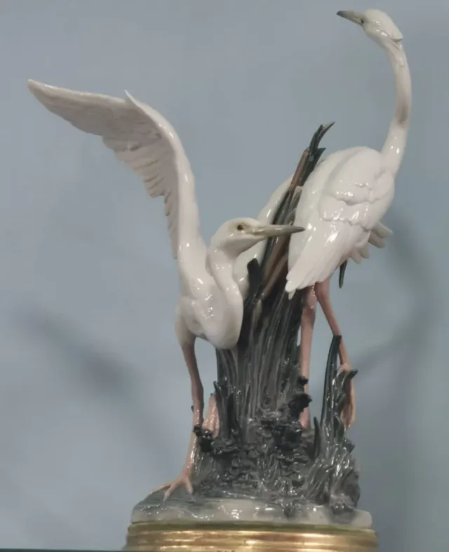 Detalles del productoPreciosa figura de dos garzas de porcelana de la marca Lladró. Representa a las aves en un entorno natural con vegetación.