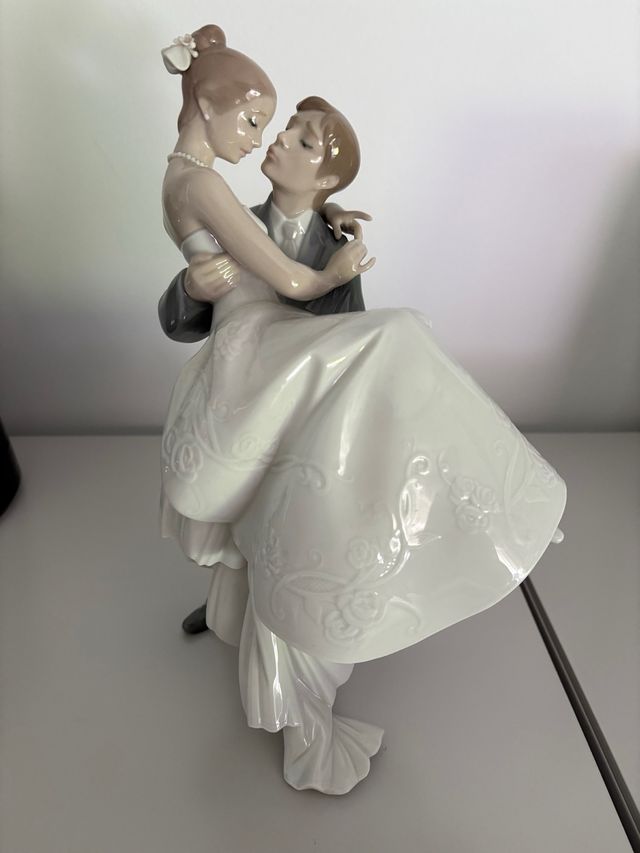 Preciosa figura de porcelana Lladró que representa a una pareja de novios bailando. - Detalle de flores en relieve en el vestido. - Acabado brillante.