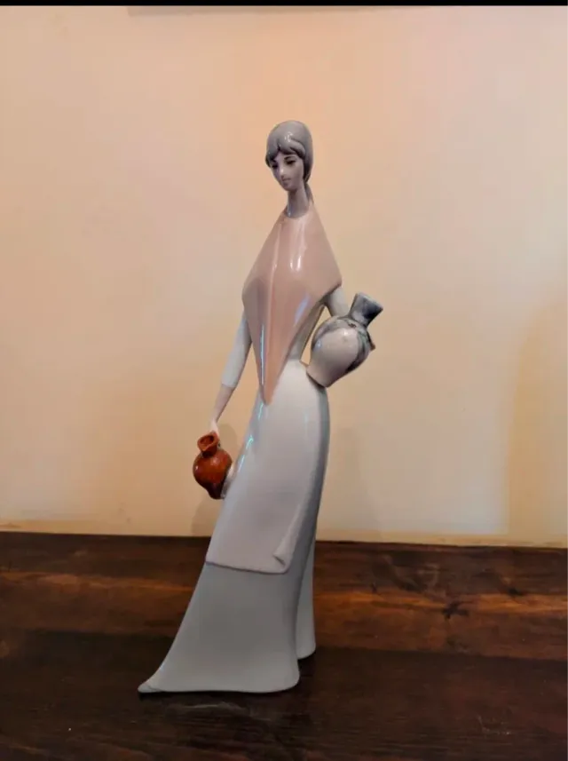 Figura de porcelana de Lladró que representa a una mujer con dos jarras. - Diseño elegante y detallado. - Acabado en porcelana de alta calidad.