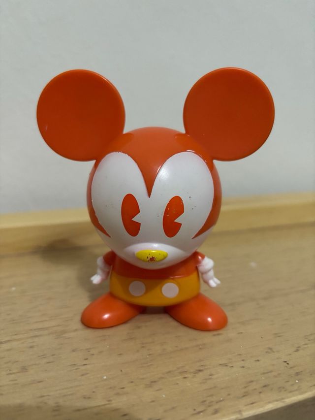 Figura coleccionable de Mickey Mouse con un diseño llamativo. - Color principal naranja y blanco. - Detalles en amarillo y naranja en la parte inferior.