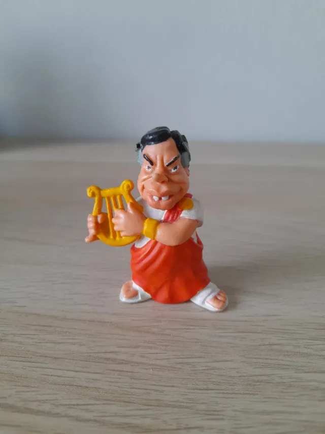 Figura coleccionable de Moncli, representando a Felipe González. - Diseño caricaturesco. - Sostiene una lira dorada. - Viste túnica naranja y sandalias.