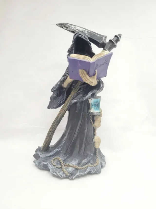 Detalles del productoLote que incluye una figura decorativa de la santa Muerte(parka),estampa con su oración y una pulsera(amuleto).Figura ideal como elemento de decoración,altar...La figura representa a la muerte con una túnica negra,guadaña(siega de almas),reloj de arena(paso del tiempo)y libro de los muertos (mortalidad)Figura hecha de poliresina, pintada a mano.