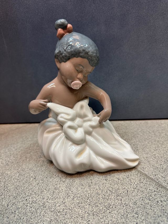 Detalles del productoFigura de porcelana de un bebé de la marca Nao by Lladró. Representa a un bebé con coletas y chupete, envuelto en una manta blanca.