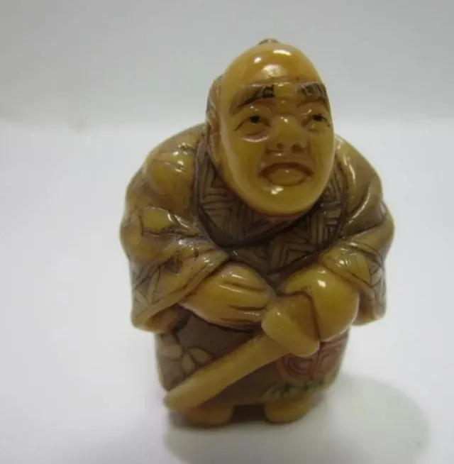 Figura decorativa tallada en nuez china. Representa a un hombre con vestimenta tradicional. - Detalle de vestimenta con motivos. - Sostiene un objeto alargado.