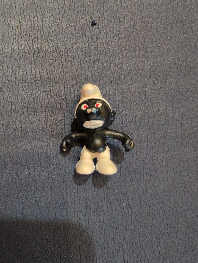 Figura coleccionable de un Pitufo. - Color negro. - Gorro blanco. - Ojos rojos. - Pantalones blancos.