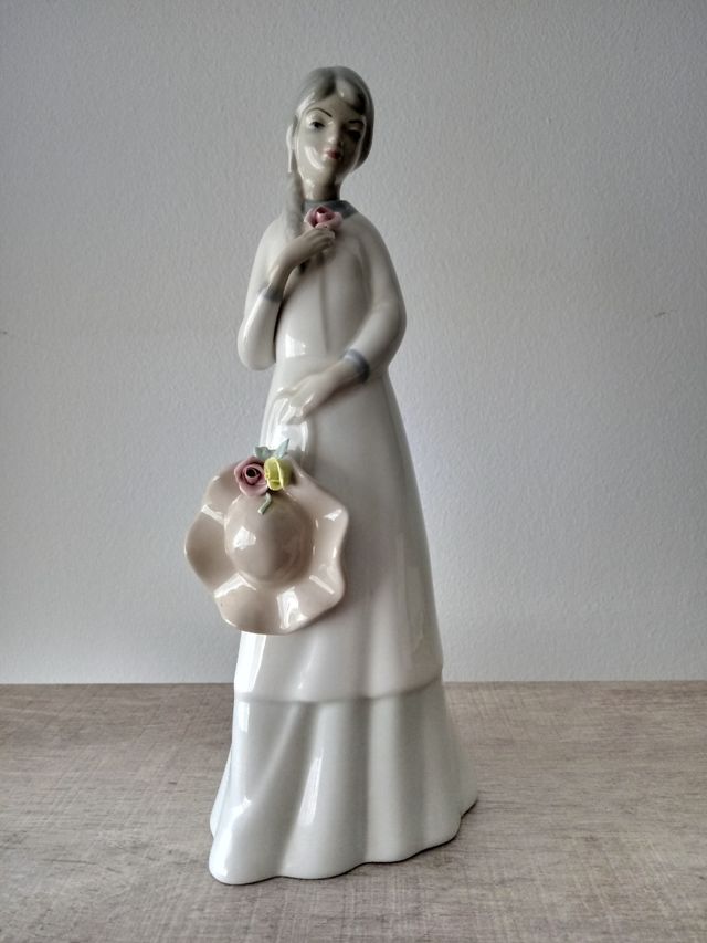 Figura de porcelana esmaltada de mujer con sombrero, con sello de autenticidad de Porcelanas Miquel Requena. 24 cm de alto.