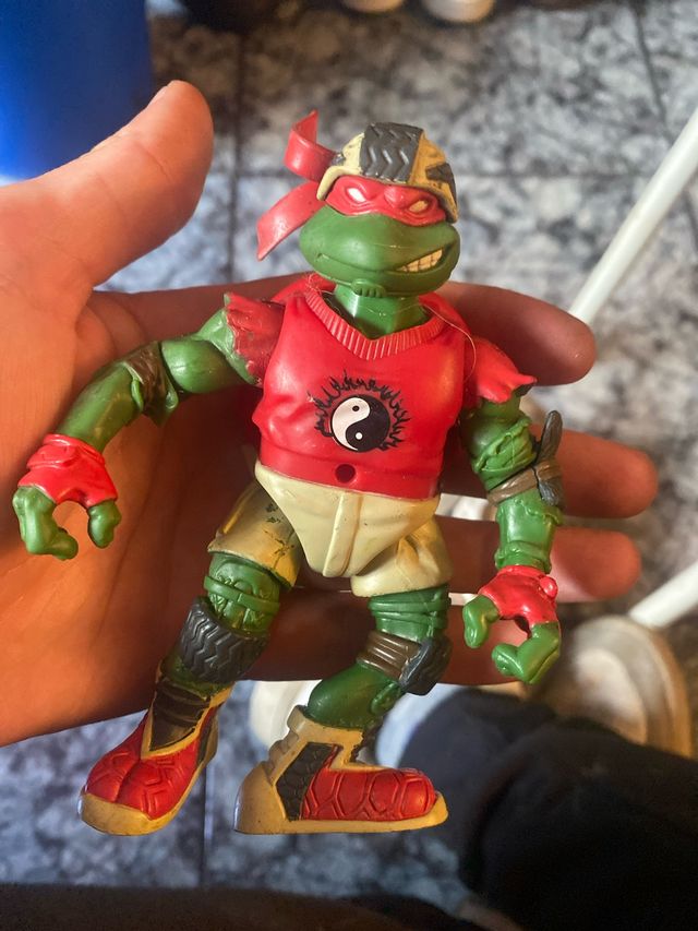 Detalles del productoFigura de acción de Raphael, una de las Tortugas Ninja. Es una figura usada, con algunas marcas de desgaste visibles en la pintura.