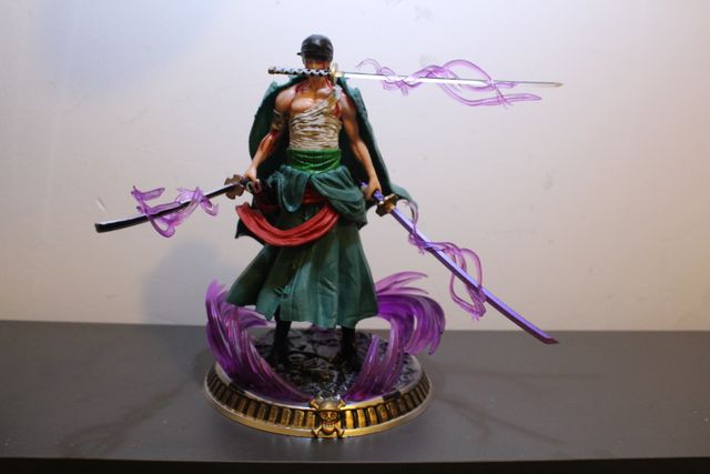 Detalles del productoFigura de Roronoa Zoro, personaje de One Piece, con su icónica pose de tres espadas.