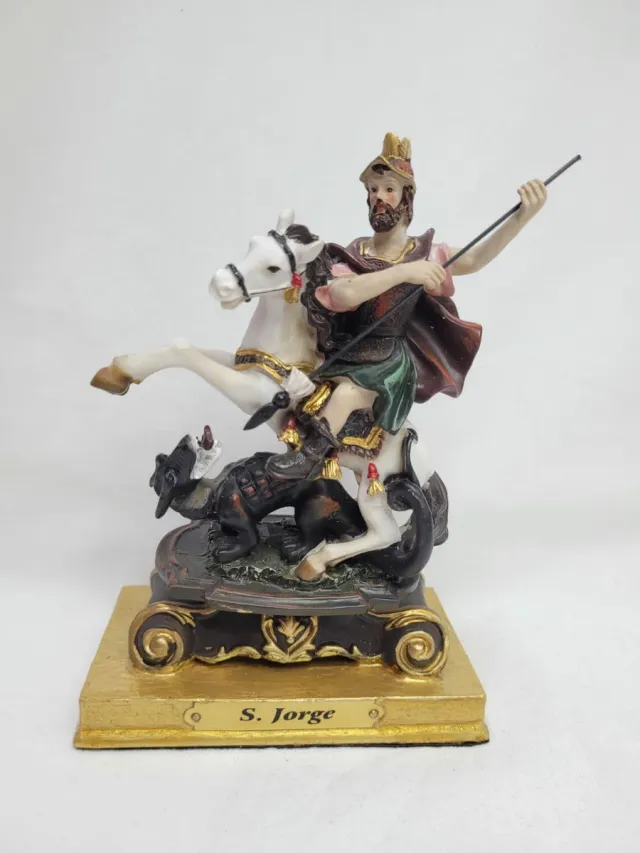 Detalles del productoPreciosos artículos religiosos de San Jorge.Incluye una figura de marmolina y un llavero amuleto con estampa oración plastificado-medalla protectora en perfectas condiones.La base tiene un acabado dorado con barniz con el nombre S.Jorge y se aprecian leves desperfectos por desgaste,deteriodo por el tiempo tal cual se aprecia en las fotos.Por lo demás la figura está perfecta.