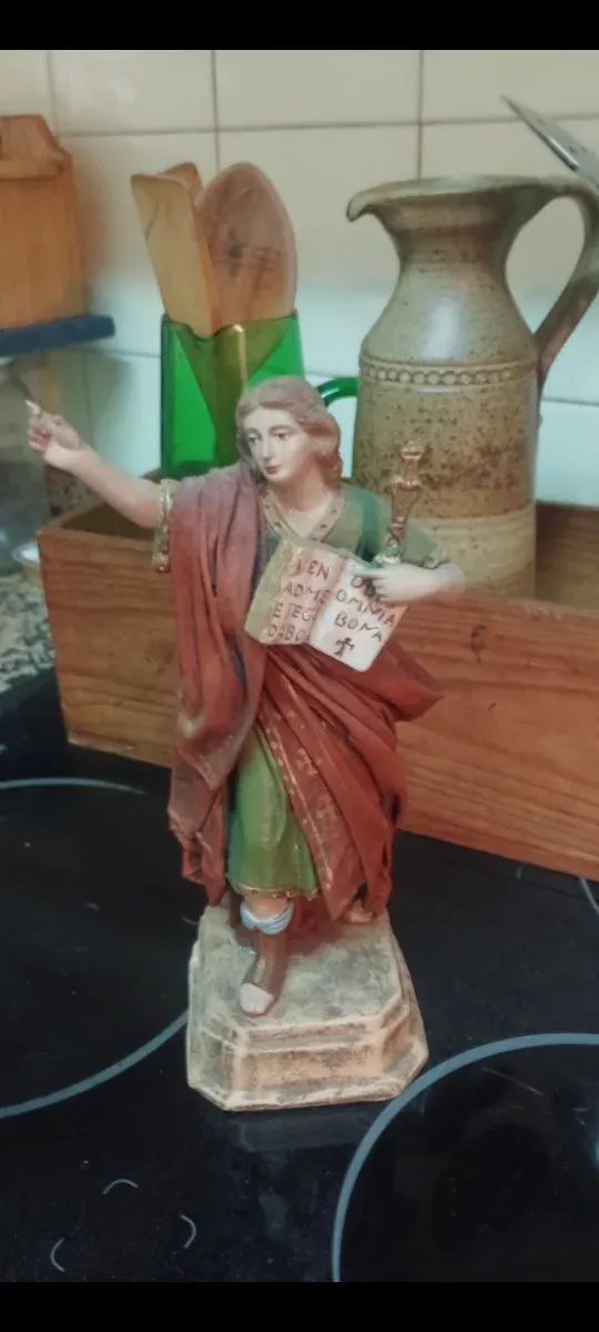 Detalles del productoFigura religiosa de San Pancracio, con detalles en dorado y vestimenta colorida.