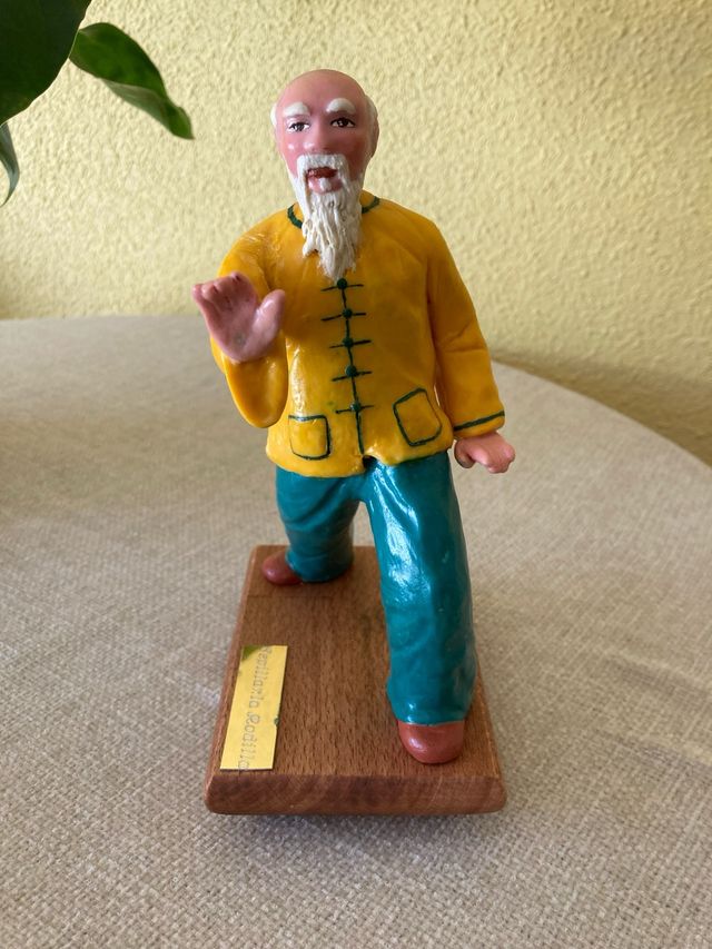 Detalles del productoFigura artesanal de un hombre mayor practicando Taichi, modelada en plastilina.
