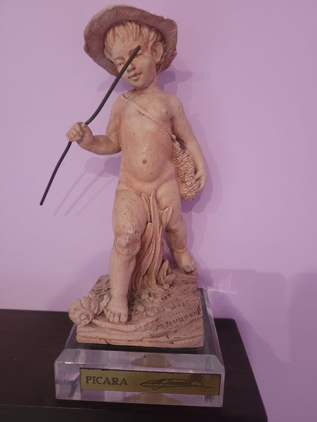 Detalles del productoFigura decorativa de terracota que representa a un niño con sombrero y una cesta.