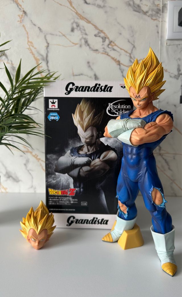 Detalles del productoFigura de colección de Vegeta en su transformación Super Saiyan de la línea Grandista. Cabeza intercambiable Majin Vegeta / Super saiyan Vegeta .