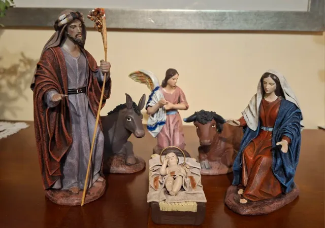 - Incluye figuras de San José, la Virgen María, el Niño Jesús, un ángel, un burro y un buey.