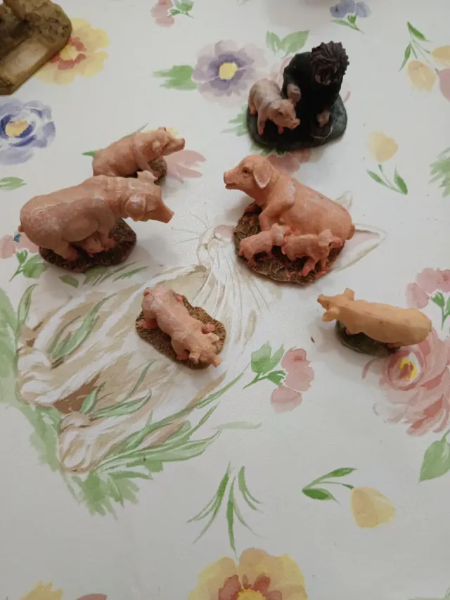 Conjunto de figuras de belén con temática de cerditos. - Incluye varias figuras de cerdos. - Detalladas y realistas.