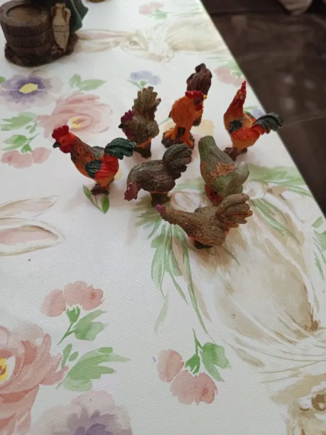 Conjunto de figuras de gallinas para belén o decoración. - Figuras detalladas de gallinas. - Ideal para escenas de granja o belén.