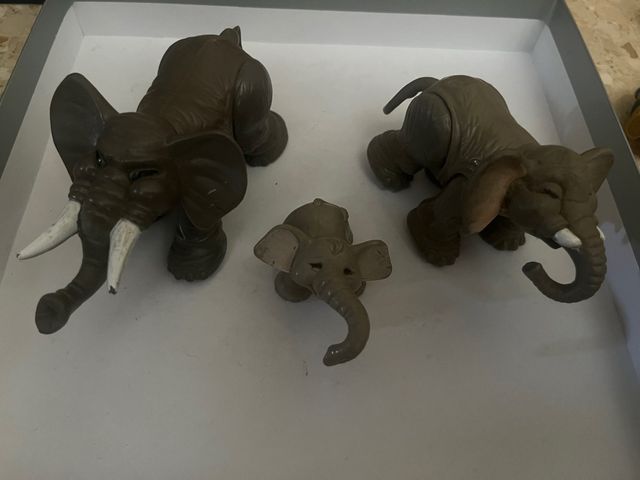 Conjunto de tres figuras de elefantes de juguete. - Elefante macho, hembra y bebe