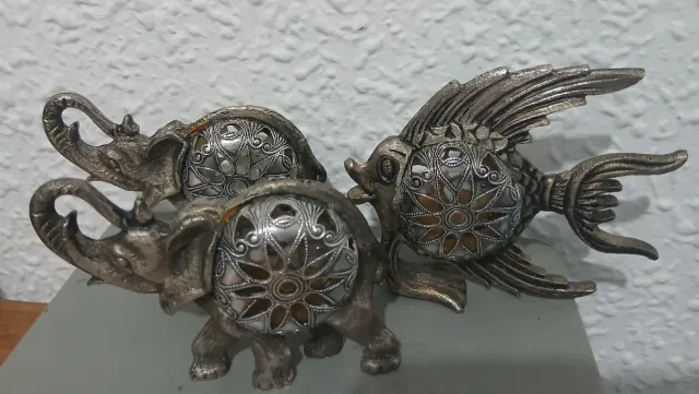 Conjunto de figuras decorativas de metal. - Diseño detallado de elefantes y pez. - Acabado plateado. - Elementos ornamentales calados.