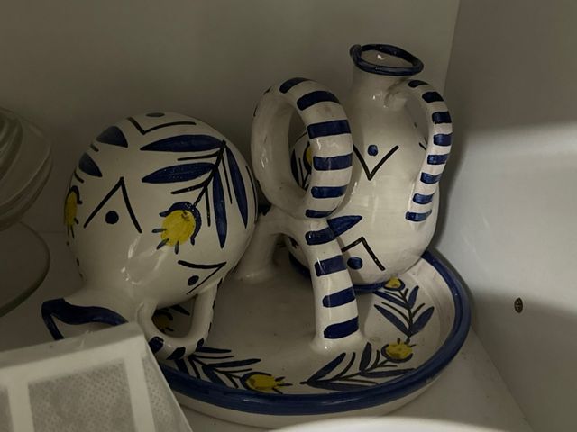 Conjunto de figuras de porcelana con un diseño pintado a mano. - Motivos de hojas y frutos en azul y amarillo. - Base decorada a juego. - Piezas únicas para decorar.