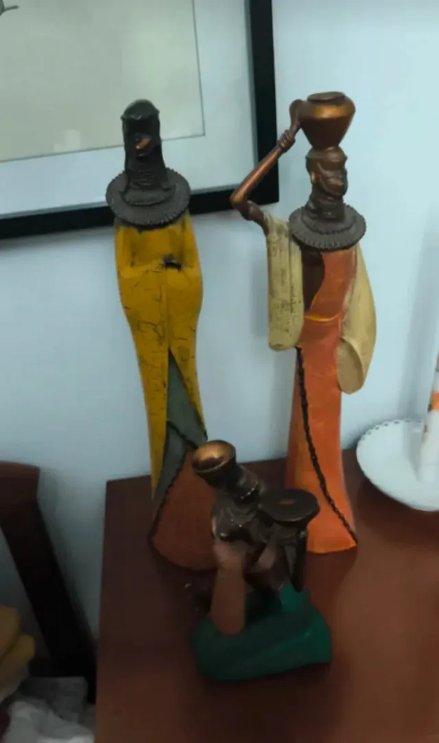 Conjunto de figuras decorativas de estilo étnico. - Diseño de figuras femeninas. - Tonos ocres, amarillos y naranjas. - Detalles en metal. - Base en color verde.