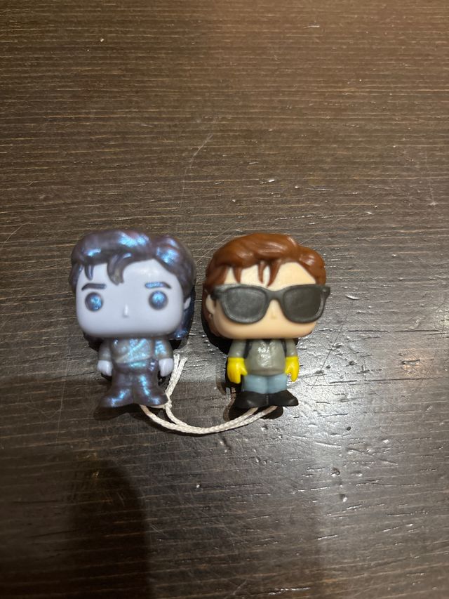 Dos figuras coleccionables de Funko Pop. Kinder Joy. - Figura de Steve Harrington con gafas de sol. - Figura de personaje con cabello azul brillante del revés.