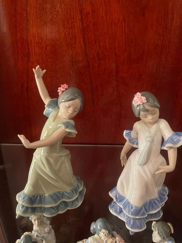 Conjunto de figuras de porcelana de Lladro que representan a bailarinas. - Diseño delicado y detallado. - Tonos pastel en vestidos y adornos florales. Le falta un dedo