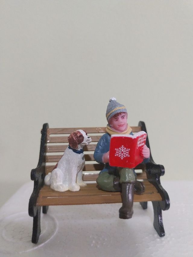 Detalles del productoPreciosas figuras de resina de un niño leyendo un libro navideño junto a su perro, sentados en un banco. Son ideales para decorar tu composición navideña o cualquier espacio durante las fiestas.
