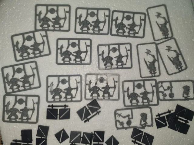 Detalles del productoLote de figuras de Warhammer del año 1992. Incluye varias miniaturas en sus matrices de plástico gris, algunas con arcos y otras con hachas.