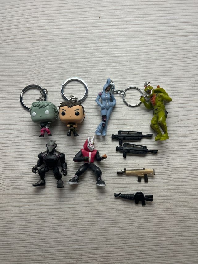 Detalles del productoLote de figuras y llaveros inspirados en Fortnite. Incluye personajes y armas.