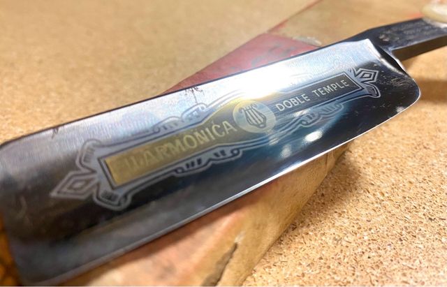Detalles del productoNavaja de afeitar SIN USAR filarmónica doble temple, modelo 14 de José Montserrat Pou (Barcelona).