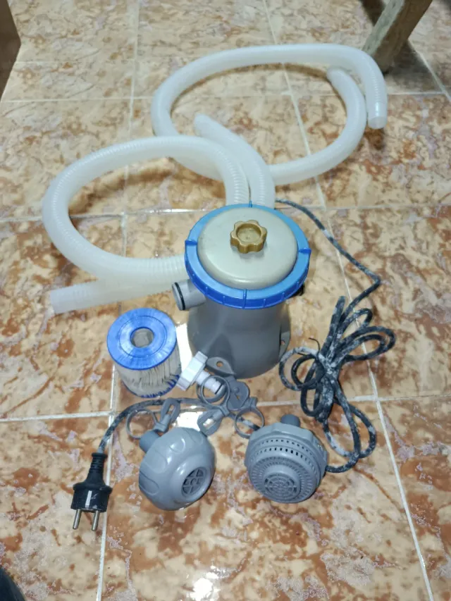 Se vende conjunto de filtro y bomba para piscina, con mangueras incluidas. - Bomba de filtración. - Mangueras de conexión. - Cartucho de filtro. - Enchufe eléctrico.