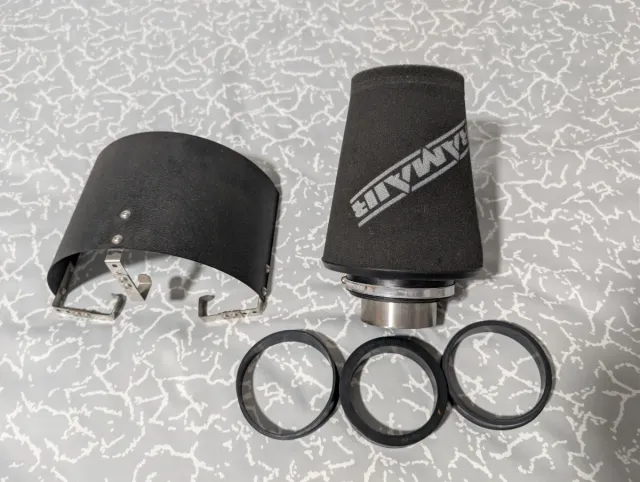 Kit de filtro cónico Ramair con carcasa anti-calórica. - Filtro de aire cónico. - Carcasa protectora negra. - Incluye adaptadores de goma.