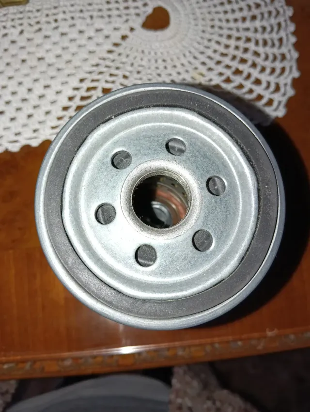 Filtro de aceite para vehículos. - Material metálico. - Junta de goma. - Diseño circular con orificios.