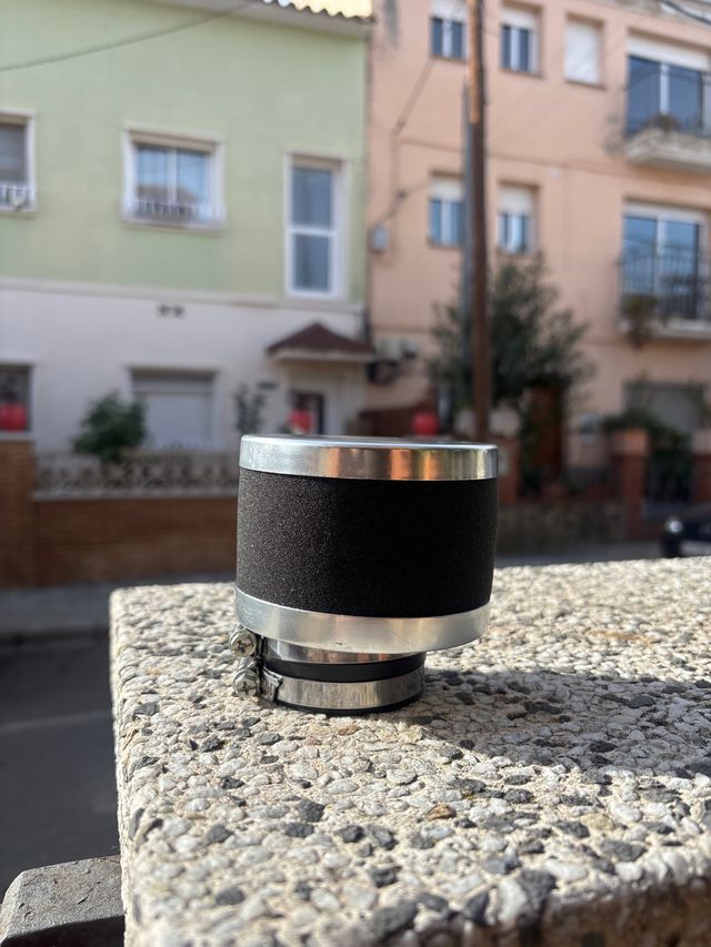 Filtro de aire para carburador con abrazadera. - Material: espuma y metal. - Color: negro y plateado. 42mm diámetro interior Me costó 40€
