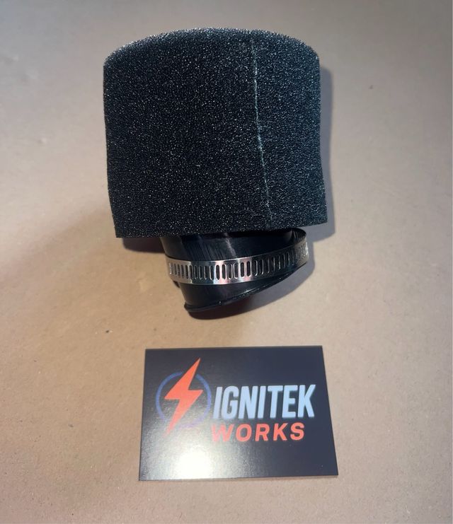 Detalles del productoFiltro de aire de espuma negra con abrazadera metálica.