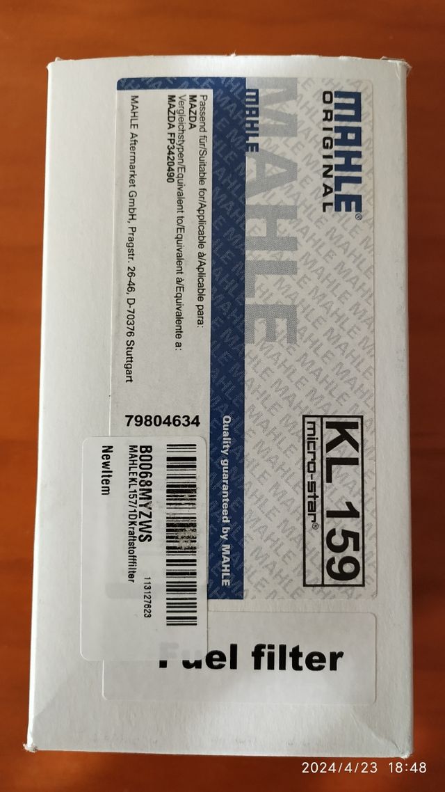 Filtro de gasoil marca Mahle, modelo KL 159.Aplicable para Mazda. Original, nuevo en su caja, sin abrir, sin usar debido a un envío de pieza erróneo incompatible con la marca de mi vehículo. Precio negociable.