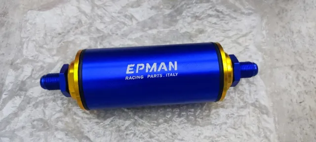 Detalles del productoFiltro de línea de gasolina universal de color azul con detalles dorados.