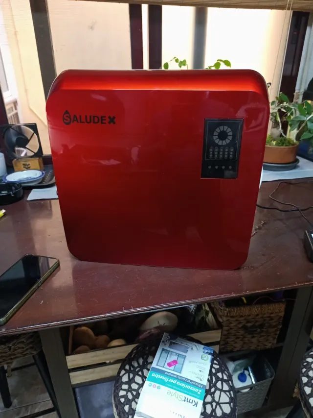 Detalles del productoSistema de filtración de agua Con bomba y depósito, modelo compacto SALUDEX en color rojo.